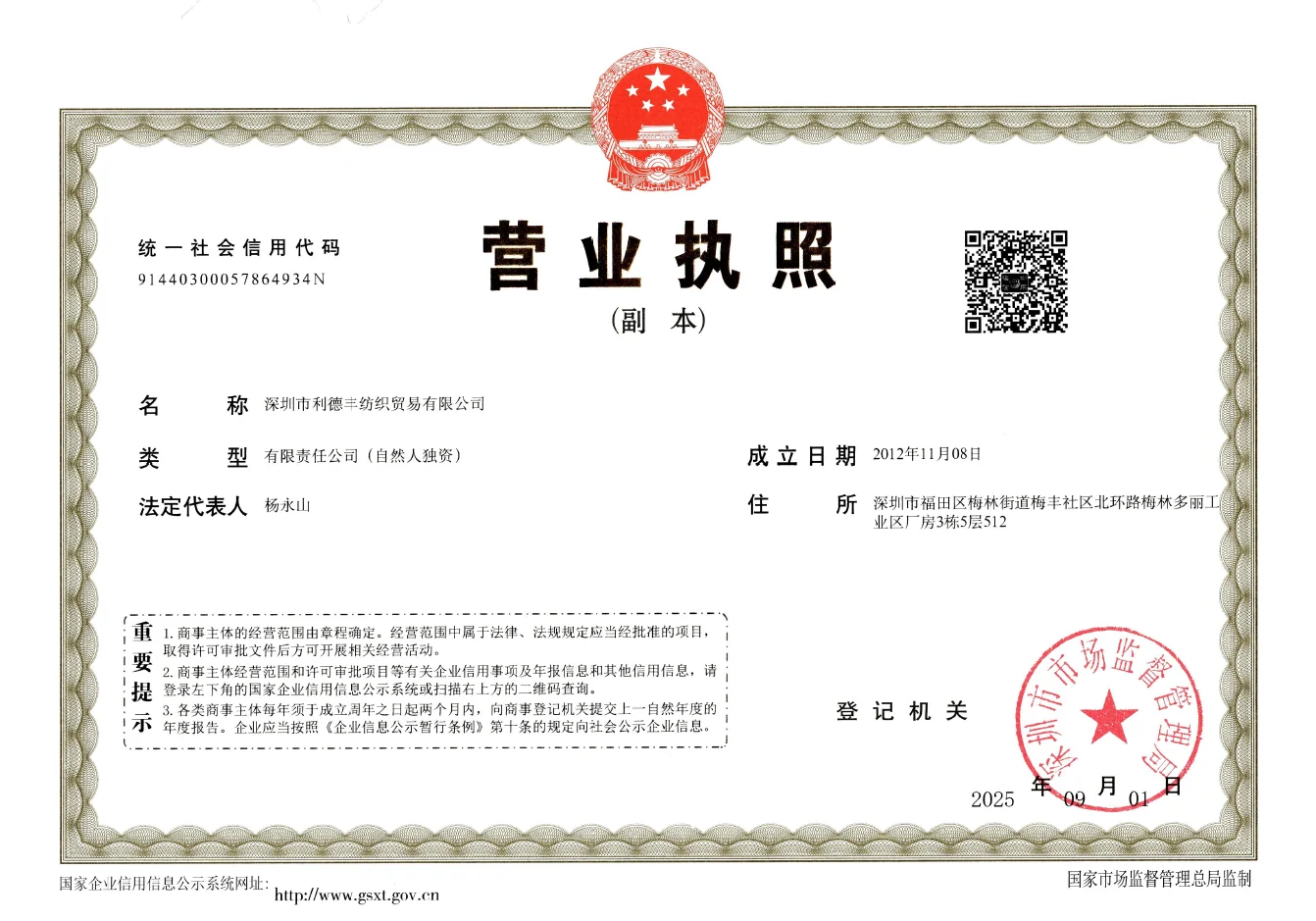 Registered address : Room 512, 5th Floor, Building 3, Meilin Duoli Industrial Zone, North Ring Road, Meilin Street, Meifeng Community Shenzhen Guangdong China